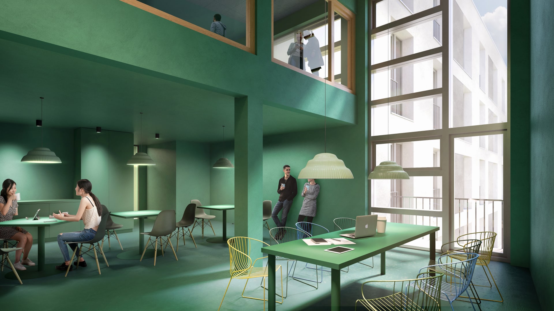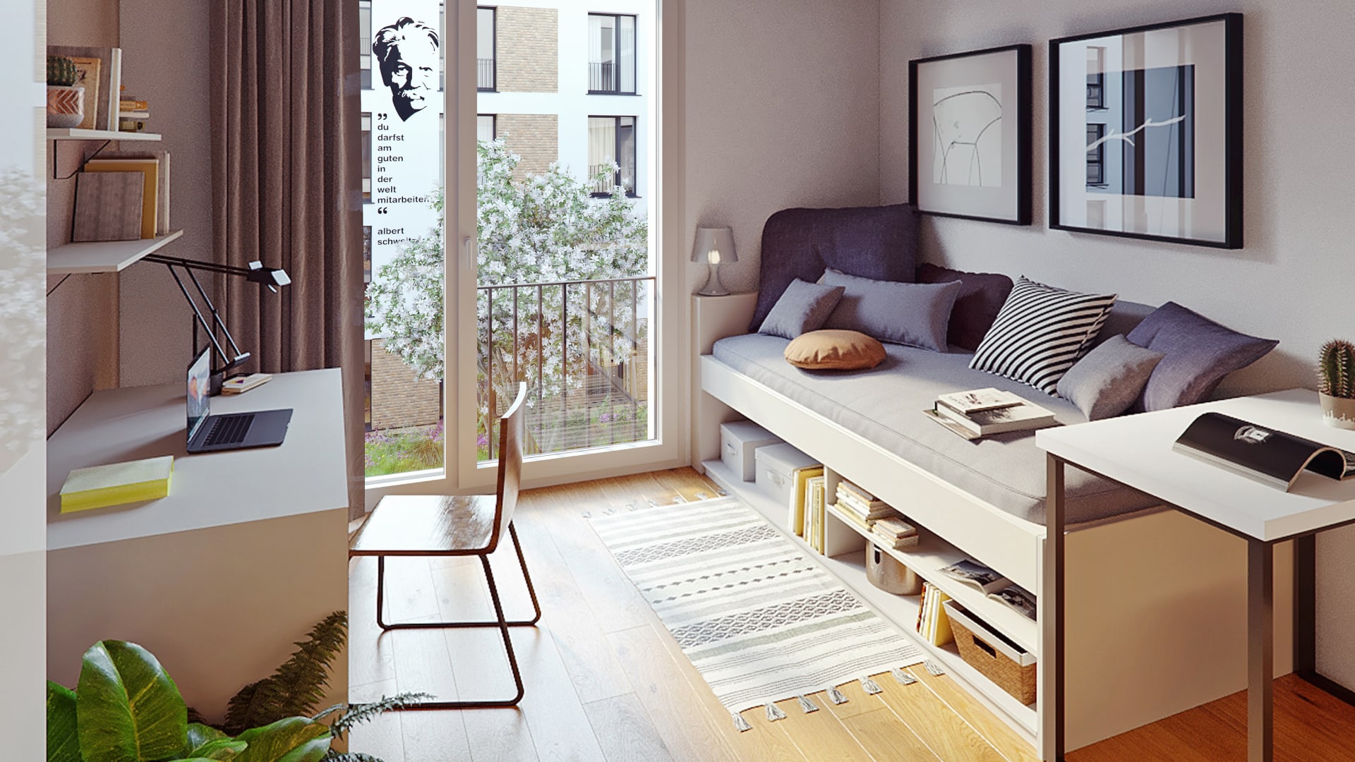 The student dormitory is part of the vibrant urban neighborhood of maxfrei, featuring spacious green areas and recreational spots. maxfrei, in turn, is located in the trendy district of Düsseldorf Derendorf. It boasts numerous bars and restaurants, excellent local and healthcare services, quick access to public transportation and the city center, sports and leisure opportunities and the immediate proximity to the Hochschule Düsseldorf (Düsseldorf University of Applied Sciences), making this neighborhood particularly popular.